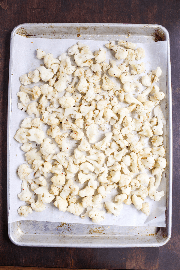 - Spread frozen cauliflower in a single layer on a parchment-lined sheet pan. Do not thaw first!