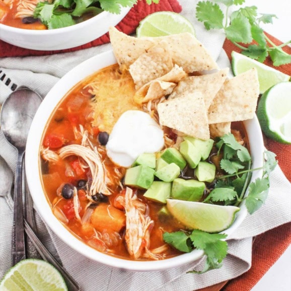 The toppings in this soup are key! I love tortilla chips (or tortilla strips), avocado, lime wedges, cilantro, shredded cheese, and a dollop of plain Greek yogurt (or sour cream) to add even more flavor and texture. Fresh cilantro is delish, too!