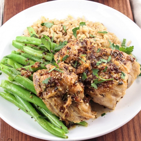 The full maple mustard Instant Pot chicken thighs recipe is at the bottom of this post. Enjoy!