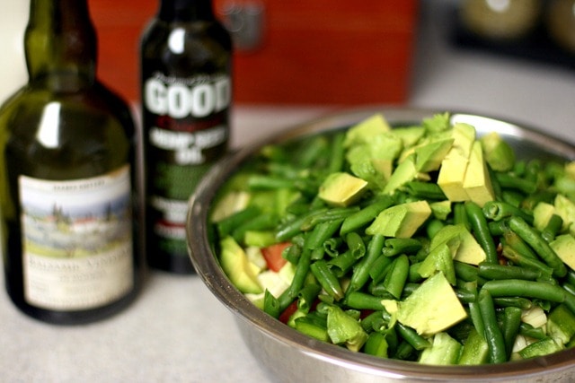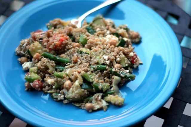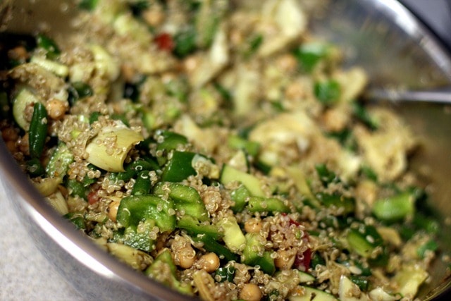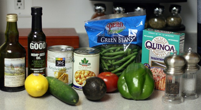 I decided to make a simple Italian-style Quinoa Salad. I cooked 1 cup of dry quinoa, then added chopped green pepper, tomato, cucumber, string beans, and avocado to it, plus a can of (drained/rinsed) chickpeas and a can of artichoke hearts (also drained).
