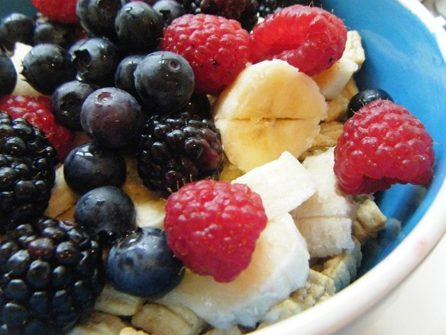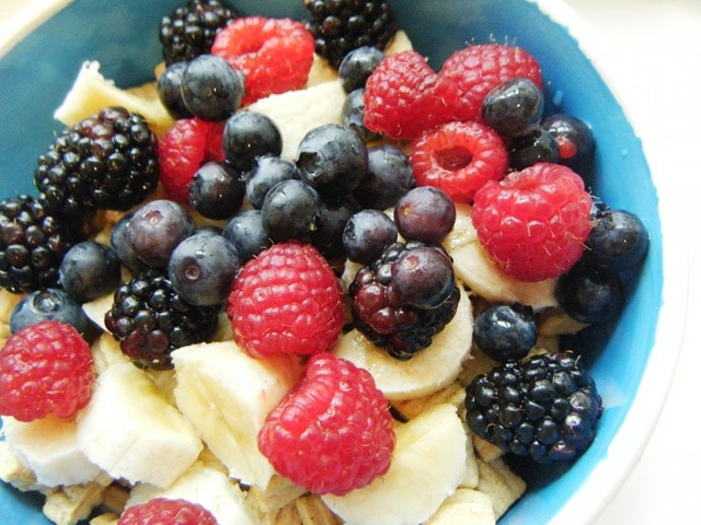 Mmm… this is a mix of Kashi Heart to Heart and Kashi Sunshine cereals, topped with a sliced banana and TONS of fresh berries!! Glorious. It was also drowned in skim milk, which I drank the last of straight out of the bowl once the cereal was gone. That’s how I roll 😉![]()