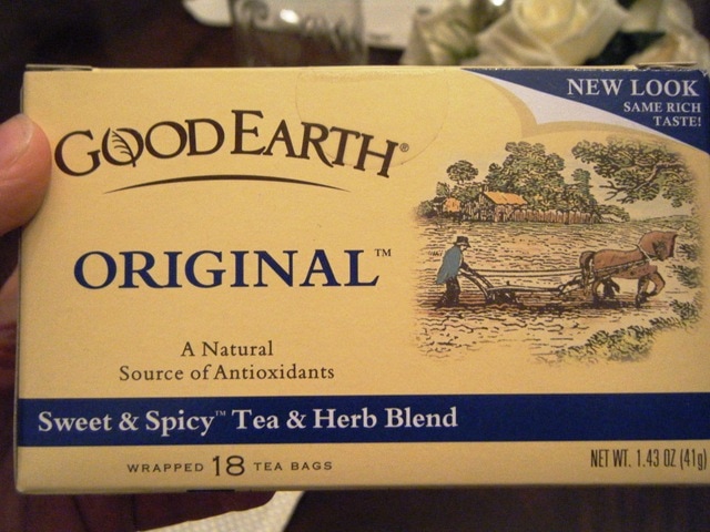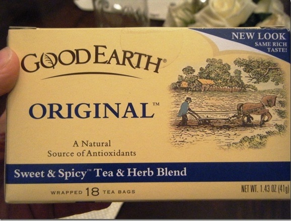 The ingredients are: Black tea, Rosehips, Cinnamon, Chamomile, Lemongrass, Peppermint, Papaya, Jasmine Tea, Anise Seed, Ginger Root, Orange Peel, and Orange Oil. Mmmm… spicy and sweet with no extra sweetener required! Smells amazing, too!