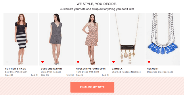 Then, you’re ready to get your first tote! A stylist will curate your tote with items from your closet and other items that fit your style. Once it has been styled, you’ll get an email that lets you know your tote will be shipped shortly – and – this is awesome – gives you the opportunity to swap out items, fix sizing, etc. (There is detailed information on the sizing of each of the items, which was really helpful so you can make sure you’re getting stuff that actually fits – this has been a problem for me with other services in the past.)
