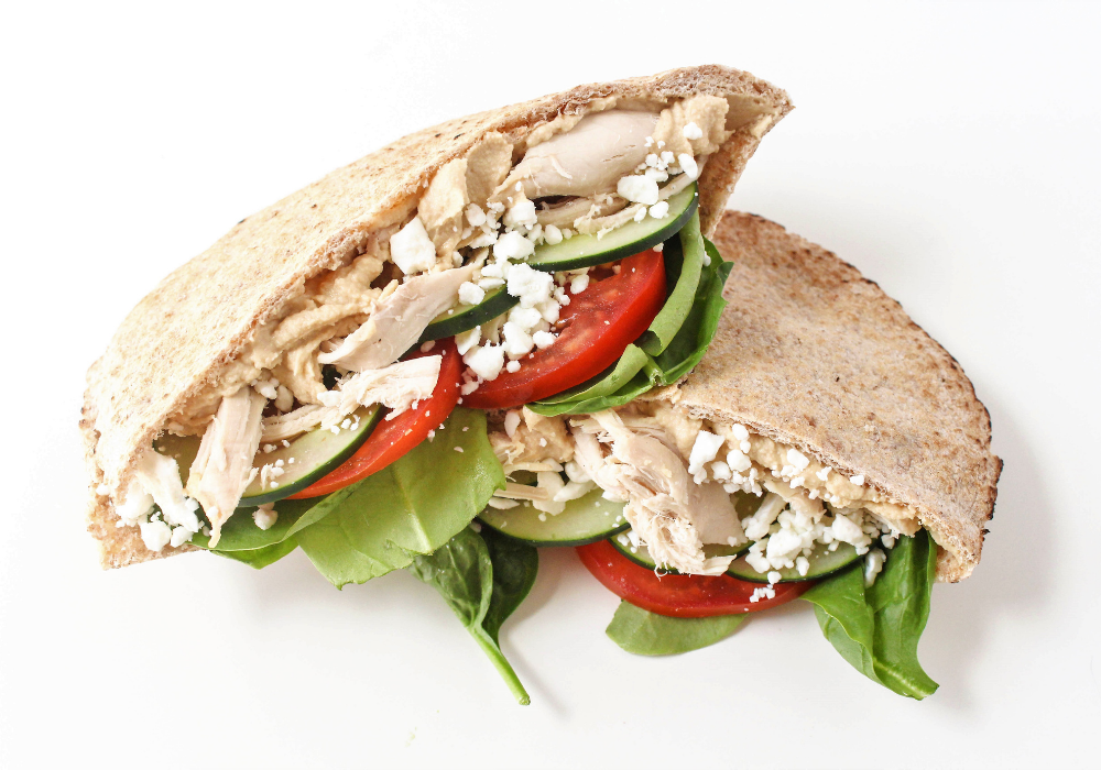 Start by spreading hummus in the pitas, then stuff with chicken and veggies. Lastly, crumble feta on top and dig in! No need to measure, just eyeball everything.