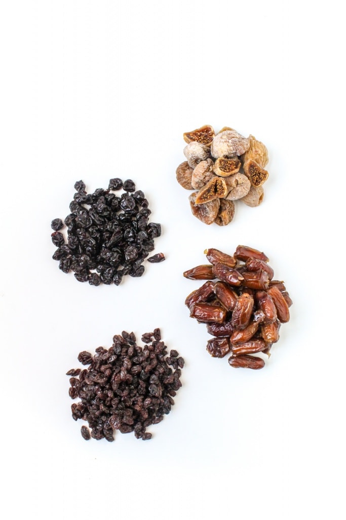 Just like with the nuts, almost any type or combination will work. I love to use dates, raisins, dried cherries, and dried figs, but feel free to play around with dried apricots, cranberries, prunes, mangoes, and more.