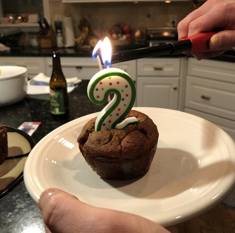 For “dessert”, I kept it low key and made Riese’s favorite muffins (Simple Mills banana muffins + pumpkin muffins // affiliate links), and we put a “2” candle in one.