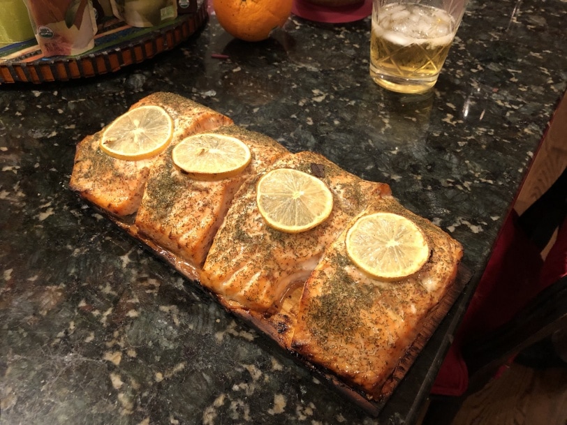 We arrived at Matt’s parents house around 5, which was nice so we had some time to relax and hang out before dinner, which was a delicious cedar plank salmon! The salmon was coated in a bit of maple syrup, whole grain mustard, and dill.