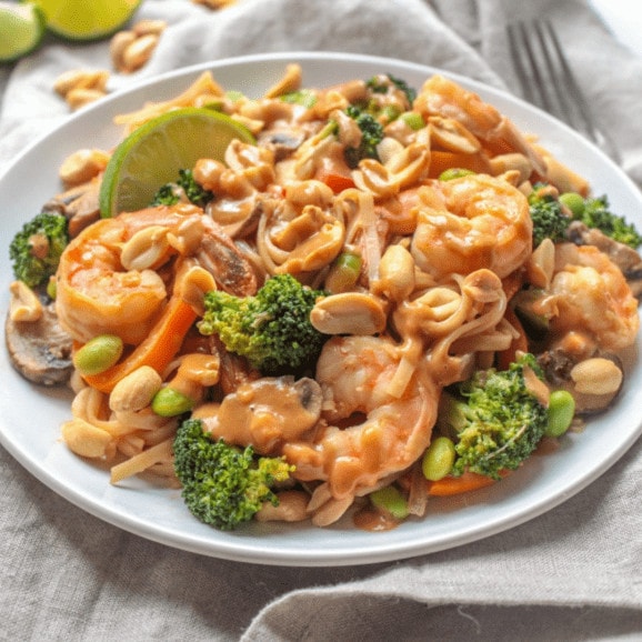 This creamy peanut sauce stir fry features plump shrimp, crunchy peanuts, tasty veggies, and optional brown rice noodles for a super easy, healthy dinner!