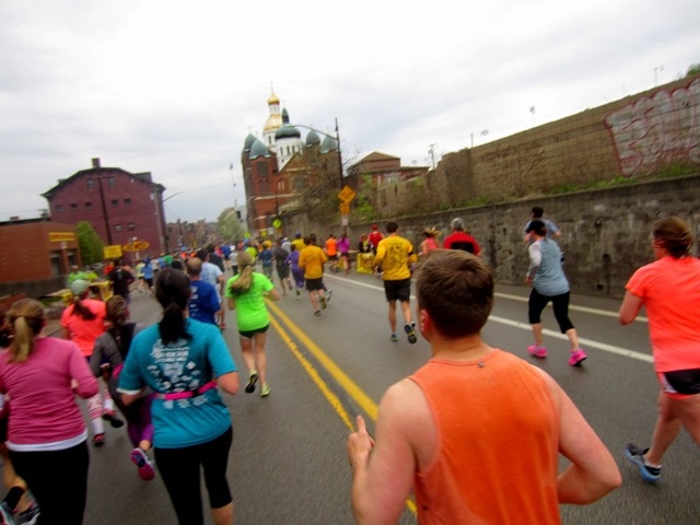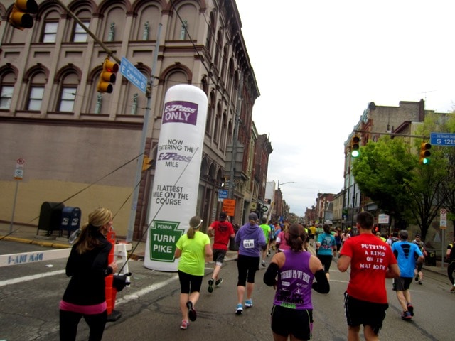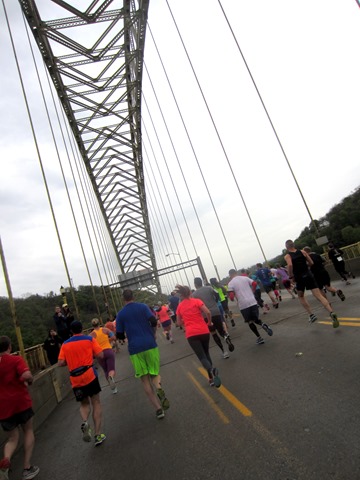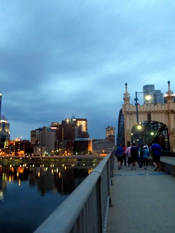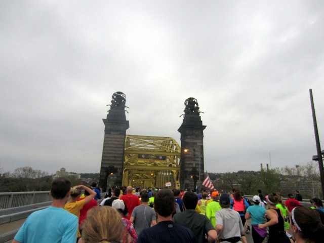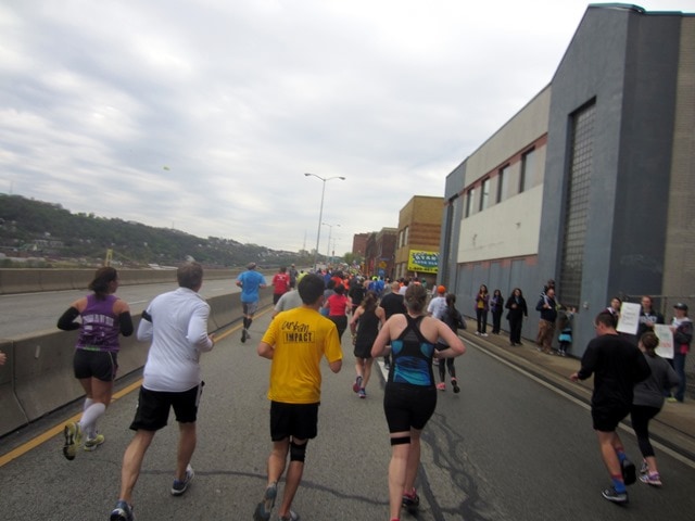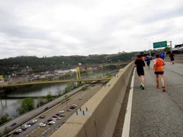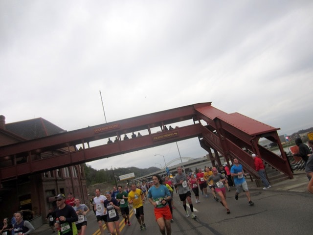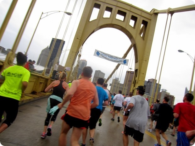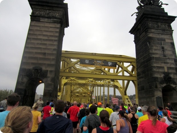 One thing to know about this race is that you run over a lot of bridges! Pittsburgh is sometimes called the City of Bridges and this race certainly lived up to that. Did you know that Pittsburgh has nearly 2,000 bridges – more than Venice, Italy? Wow! We didn’t run over quite that many during the race, though, thankfully. 😉 We ran over 5 bridges total, which gave us really nice views of the city. It was fun to see so much of the city! But bridges also meant that we had to conquer the hills up the bridges. 😉