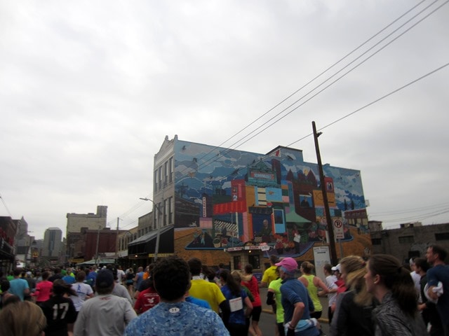 After our pit stop, we set to speeding up to our goal pace of 8:30. I had some trouble keeping up with the guys here – it was so crowded and they were weaving in and out of people like crazy! I just focused on not losing them and on taking in the scenery. I loved the beautiful painting on the building in the photo below!