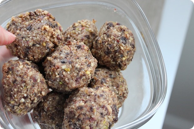 Last but not least in this hodge podge of recent eats is a variation on my Tart Cherry Pie Snack Balls! I used half dried tart cherries and half raisins, and also added some extra nuts – about a half cup of pecans and a few pistachios! Basically whatever was floating around in the pantry. 🙂 My college BFF Turner and I enjoyed snacking on these over the weekend, and I’ll be eating the rest this week!