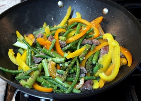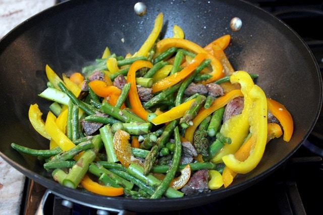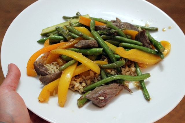 One night last week Matt and I threw together a really easy stir fry for dinner – peppers, asparagus, and frozen string beans with some grass fed beef. We used Tessesmae’s Soy Ginger dressing as the sauce and threw it on at the last minute. Served atop brown rice!