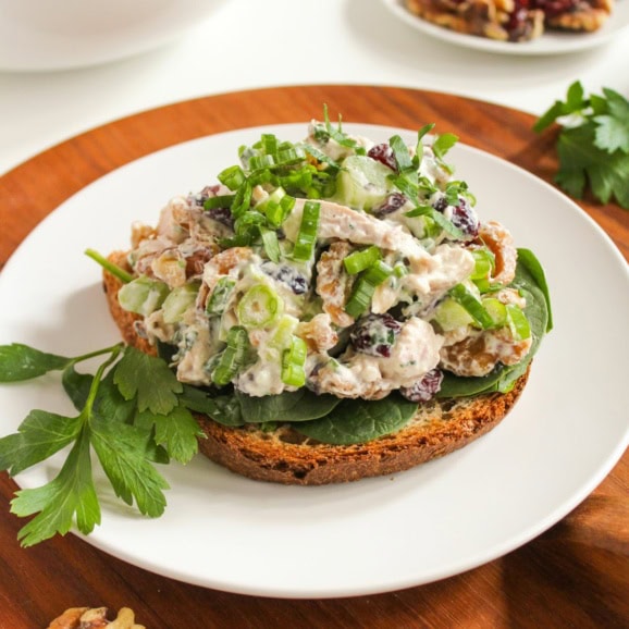 This Greek yogurt version of Waldorf chicken salad is unbelievably tasty! You’ll be an instant convert, I promise. 🙂 It’s full of tangy flavor and creaminess, with crunchy walnuts, sweet-tart dried cranberries, crisp apples, fresh herbs and more.