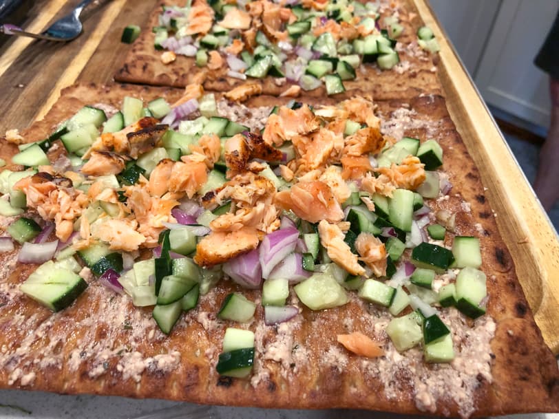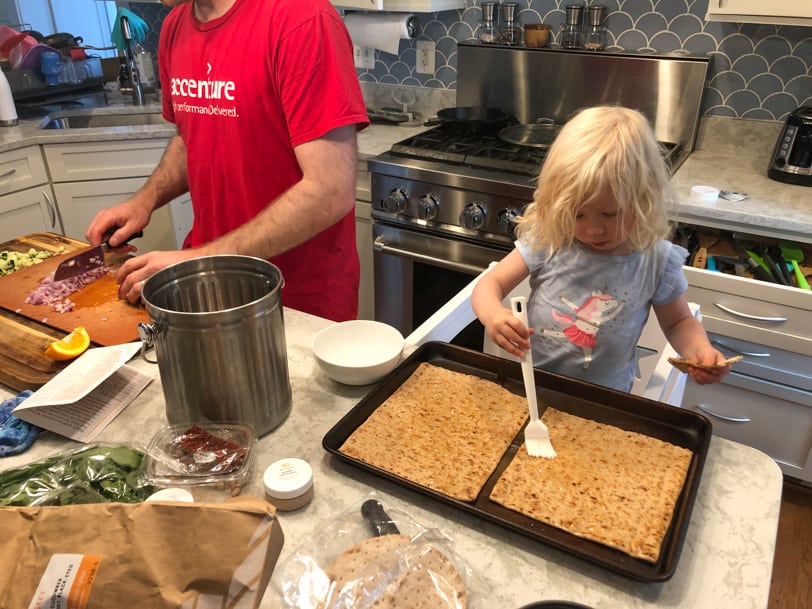 Last night, we had a salmon flatbread Sun Basket dinner – Riese really liked brushing garlicky oil on the flatbread: