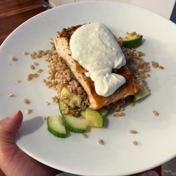 We made a ton of salmon earlier in the week to eat on the leftovers for easy meals later. My favorite meal prep salmon recipe is my Easiest Baked Salmon Recipe.