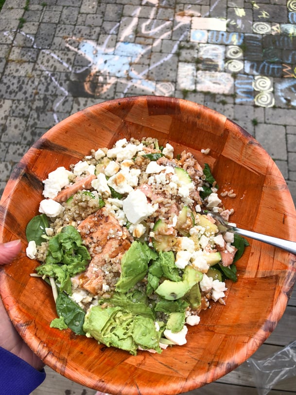 I had some of the leftover salmon for lunch one day in the form of a quinoa salad with feta, greens, avocado, and a homemade balsamic vinaigrette, plus a side of chalk art.