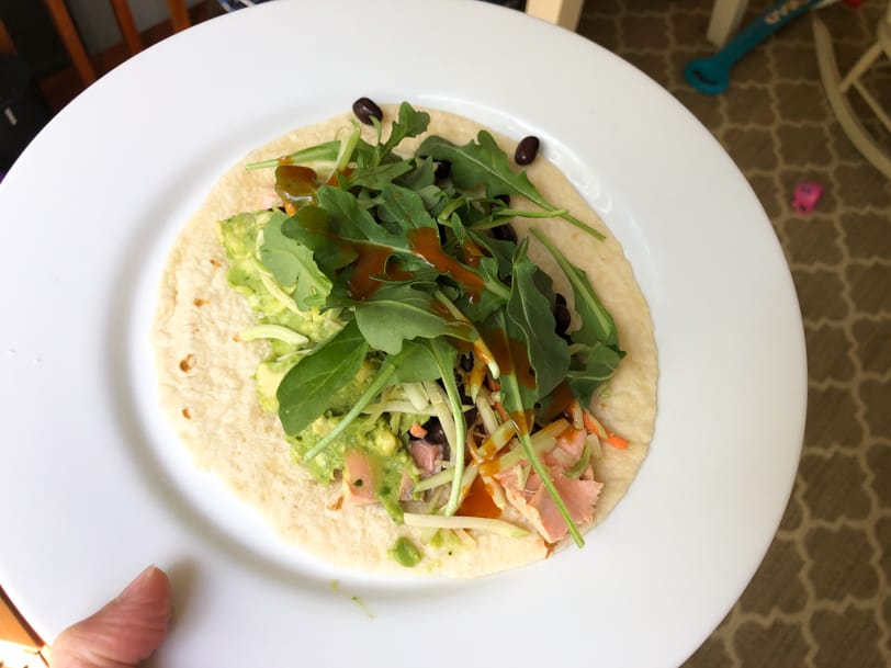 I made Riese a mini one with just salmon, black beans, and guac and she liked it too! She’s obsessed with tortillas.