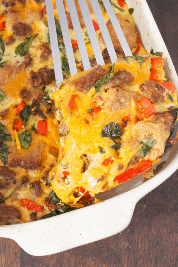 - Grease a 9x13 baking dish. In the dish, place the bread, sausage, and chopped spinach and bell pepper. Pour the egg/milk/mustard mixture over top, then sprinkle with cheese.