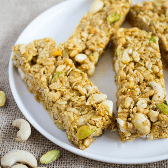 This easy and delicious savory curry granola bar recipe makes a great healthy on the go snack. No bake and gluten free (with gf oats/rice cereal), too!