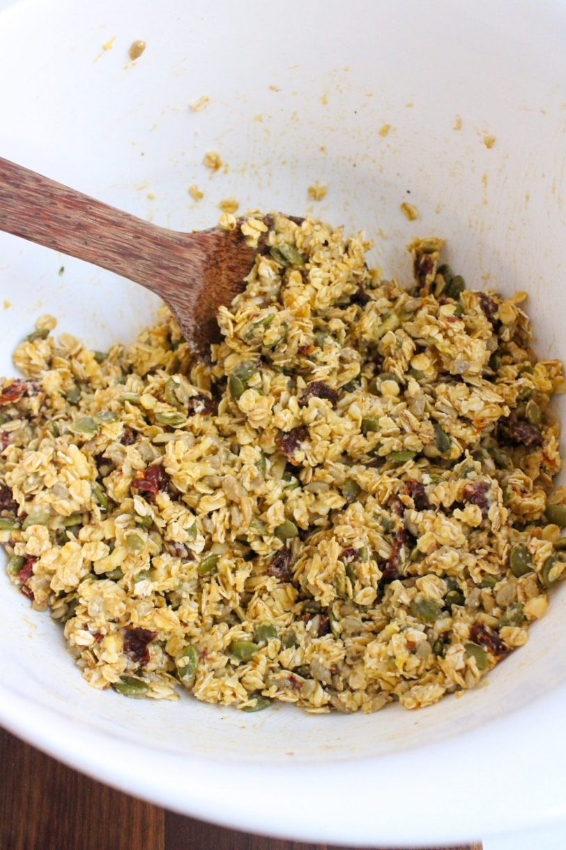 I already have a no-bake savory granola bar recipe here on the blog (my Savory Curry Granola Bar Recipe), so I thought it would be fun to share a baked version this time.