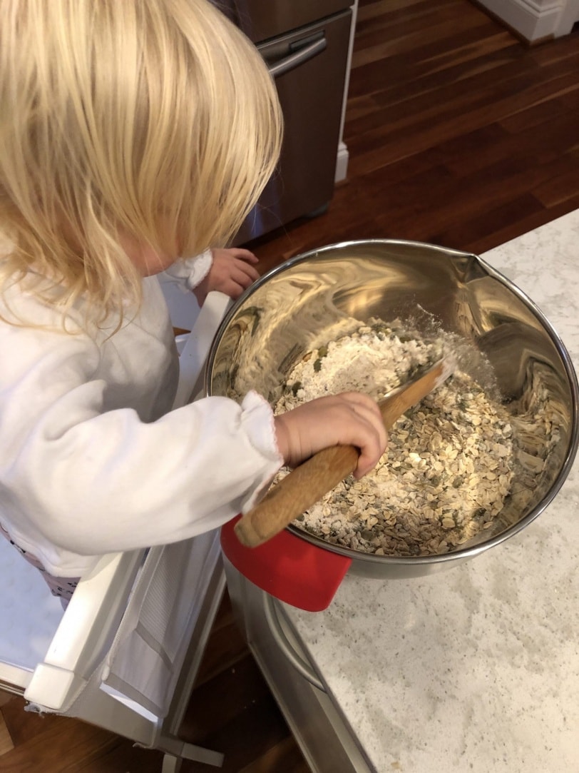 Riese really enjoyed “helping” me test this recipe – she liked dumping all the different ingredients into the bowl, stirring… and eating all the seeds and cheese out of the bowl, too. 😉 Quality control…