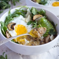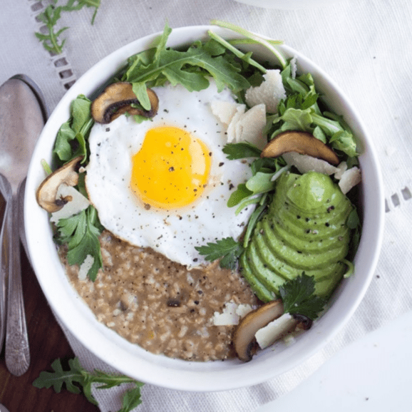 Hearty and so satisfying, this savory oatmeal recipe is an amazing high-protein breakfast to start your day. Steel cut oats and mushrooms are cooked on the stovetop until creamy and delicious, and then topped with fried eggs, sliced avocado, baby arugula, and whatever other toppings you like! This healthy breakfast idea would also work wonderfully for lunch or dinner, too.