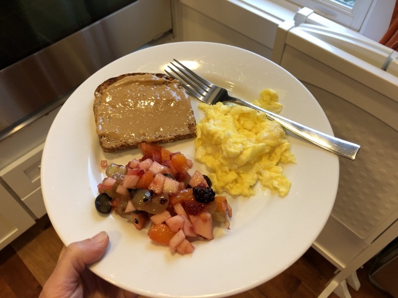We had a lot of scrambled eggs this week outside of burritos, though – we had a dropped egg carton situation but Matt was smart and cracked all the broken eggs into a bowl right away so we were still able to use them. Scrambled eggs it was! Plus peanut butter toast and fruit salad.