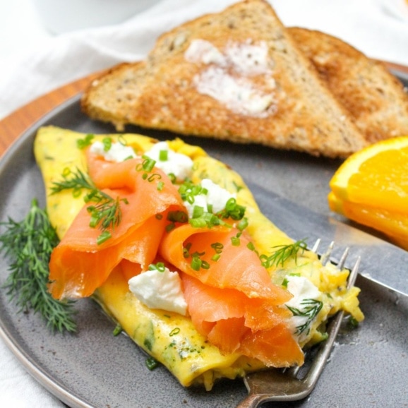 Creamy goat cheese and tender smoked salmon make delicious fillings for an omelette! Whether you’re looking for a casual weekday breakfast or a fancy brunch recipe, this smoked salmon omelette is perfection.