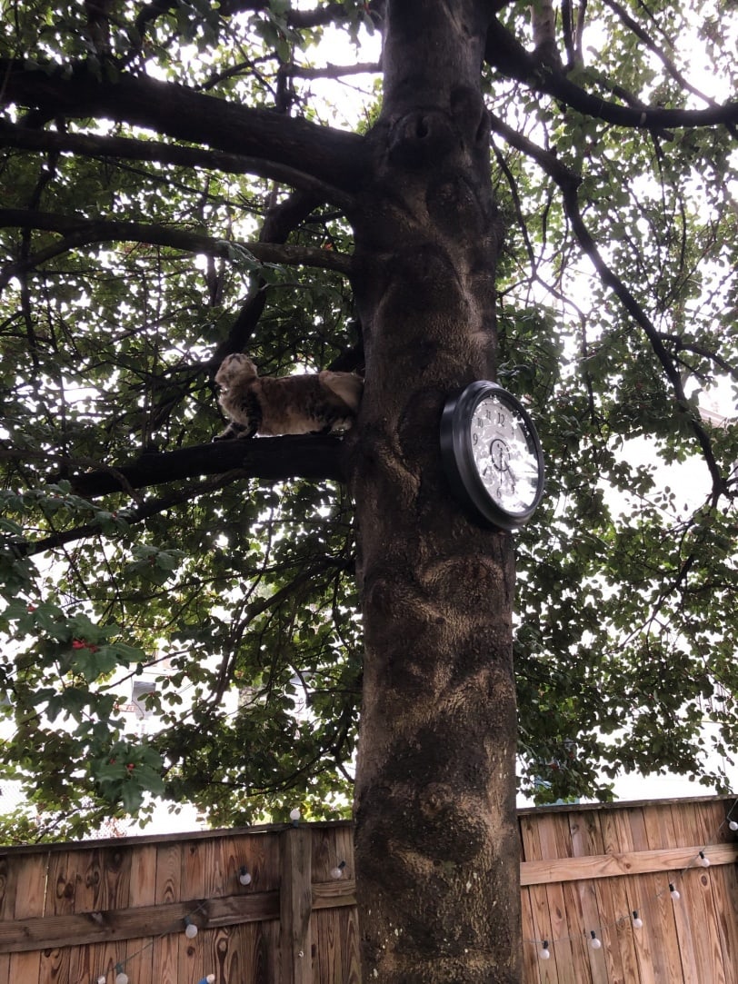 In other news, Zara is quite the escape artist – she always runs out when Riese opens the back door for Freyja to go in the yard. On Tuesday Riese and I were hanging out in her playhouse outside, and I looked over and saw this – quite the adventurous kitty!