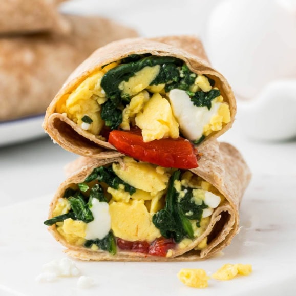 If you love the spinach feta wraps from Starbucks like I do, then my copycat version (which uses the whole egg instead of just egg whites for added nutrition) is an absolute must-try! These easy breakfast wraps are stuffed with fluffy scrambled eggs, spinach, melty feta cheese, and optional roasted red peppers.