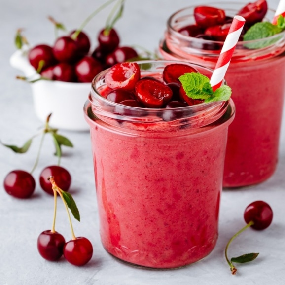 Cherry season usually starts around mid-April or May and goes through late July or early August. So summertime is the best time for fresh cherries! (You can also buy frozen cherries year-round to make this smoothie).