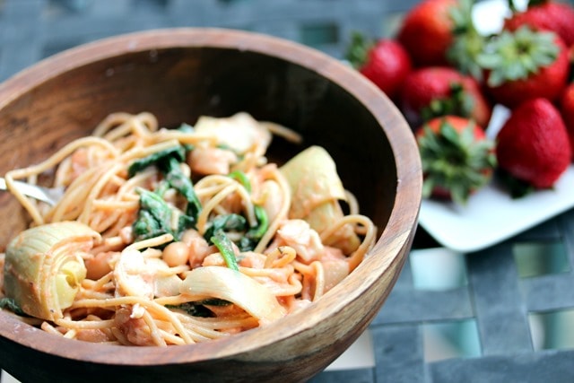 The Tomato Kick juice has all sorts of fun stuff in it – tomato, celery, red bell pepper, carrot… sounded like the makings of a nutritious pasta sauce, which is where I got my idea to use it in a cold summer pasta salad! I knew right away that it would be need to include artichokes – every since Italy, I’ve been obsessed.