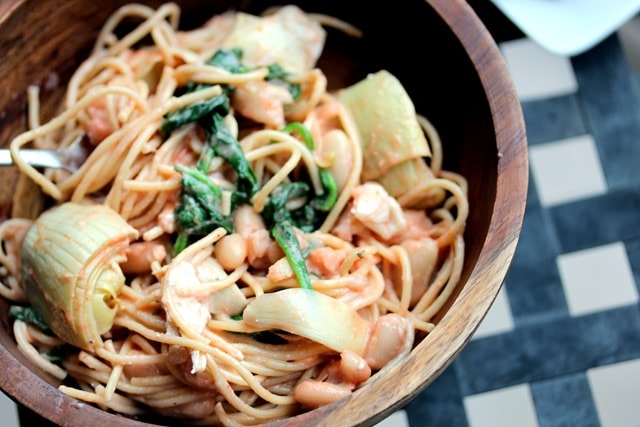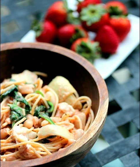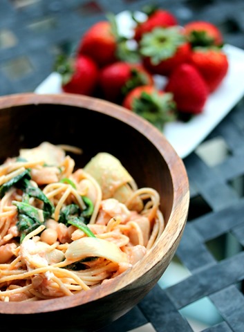 - 2 C cooked whole wheat/grain pasta, any shape (I’m partial to spiral pasta but didn’t have any on hand, so spaghetti it was)