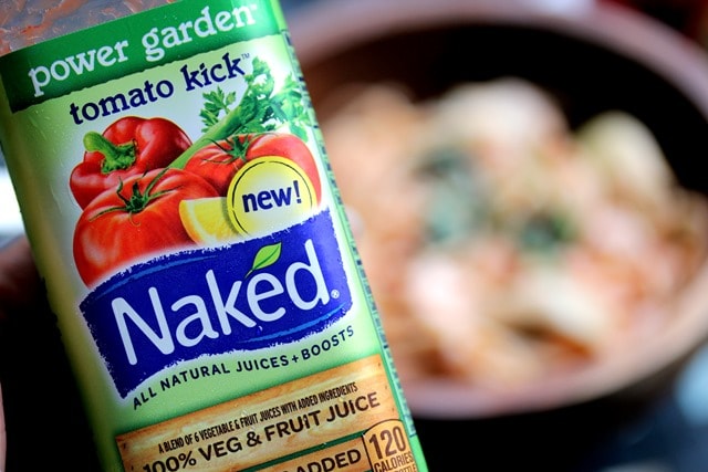 A couple weeks ago, I was given the challenge to come up with a recipe using one of Naked Juice’s new Power Garden juices: either Tomato Kick or Berry Veggie. The obvious choice would have been a berry smoothie or an amped up Bloody Mary, but I decided it would be more fun to get creative. 😉