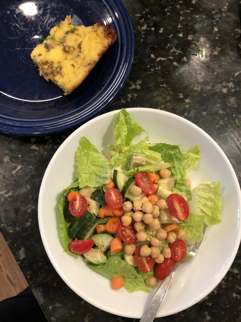 - Mashed potatoes (a garlicky artichoke mash was mixed in and was delicious – just throw a can or two of artichokes into a blender with some garlic cloves and a little milk, blend, then add that into the mashed potatoes for great flavor!)