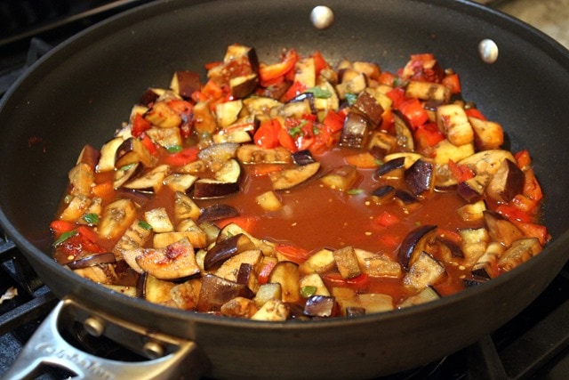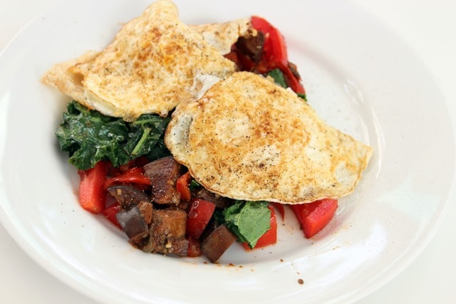 We had some eggplant/pepper mix leftover that I turned into brunch for myself on Sunday by tossing it in a pan with garlic and kale and putting two fried eggs on top.
