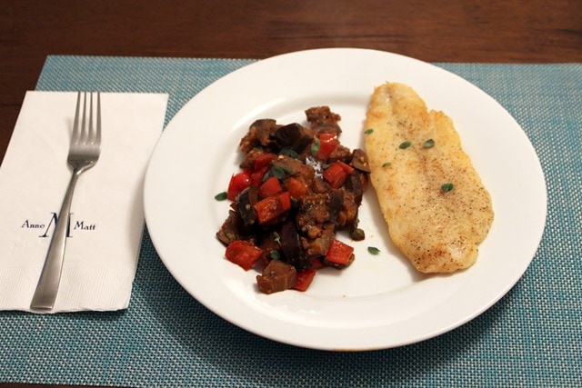 Last week’s Blue Apron delivery (paid for on our own dime – we are obsessed and get it every week outside of/unrelated to my partnership with them) had a really tasty seared catfish with eggplant and peppers. Matt was busy on Thursday night so I invited my mom over to enjoy it with me.