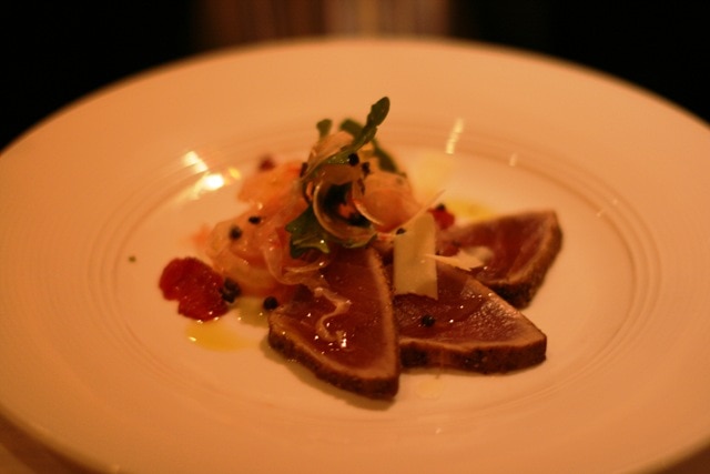 For our first course, both Matt and I ordered the fennel-crusted tuna carpaccio,which came with shaved fennel salad, organic baby arugula, blood orange, capers, grana padano, and extra-virgin olive oil.