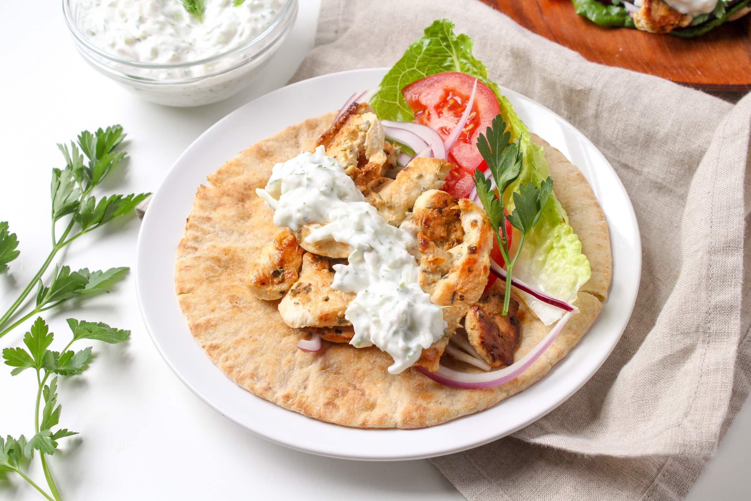 It’s a super refreshing, creamy sauce with a lightly sweet flavor. The perfect spread for these easy chicken gyro wraps on pita bread!