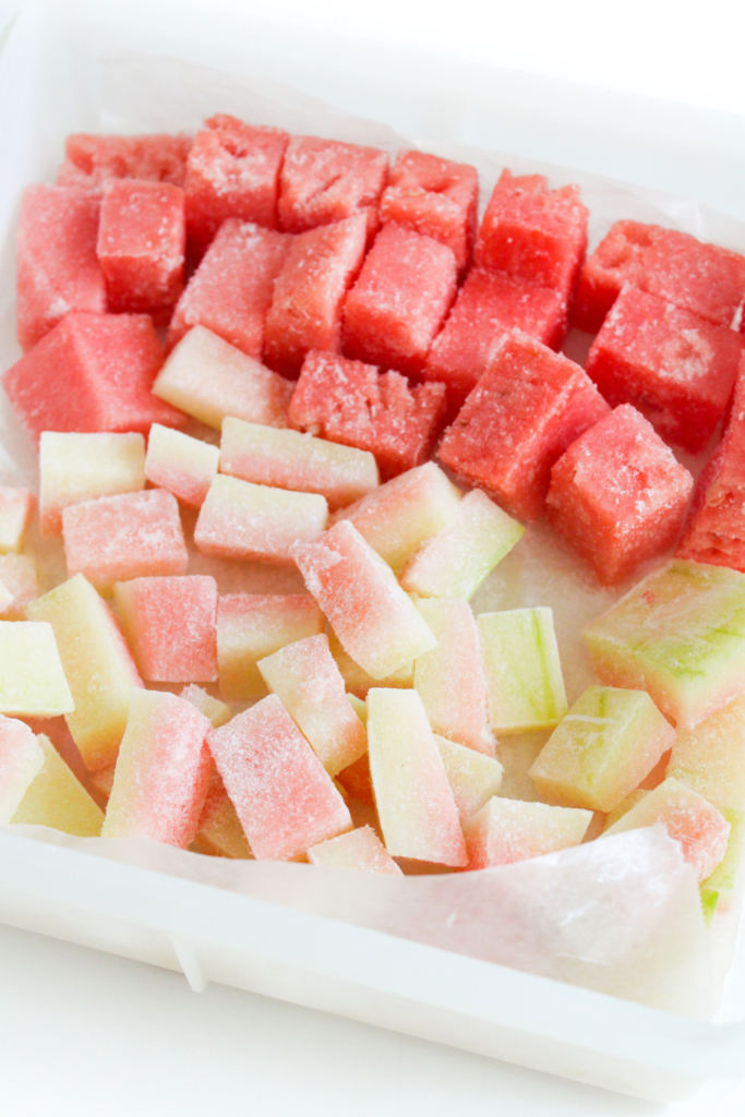 Next, arrange the watermelon chunks in a single layer in a wax paper-lined flat container or sheet pan. Make sure there’s a little space in between the cubes, so they don’t freeze together in a large clump.