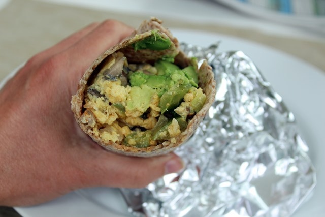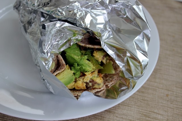 When I got home, I repurposed Saturday morning’s egg and veggie scramble leftovers into wraps for me and Matt. I used a sprouted grain wrap and tossed some avocado and hot sauce (chili garlic Cholula = the best) in them, too. Wrapped in foil because it made them easier to eat so they didn’t fall apart!