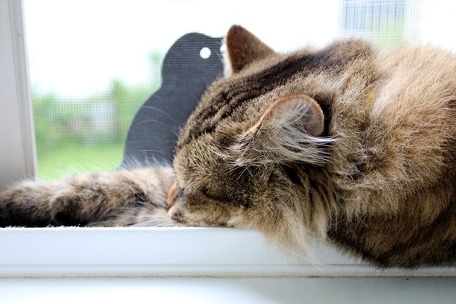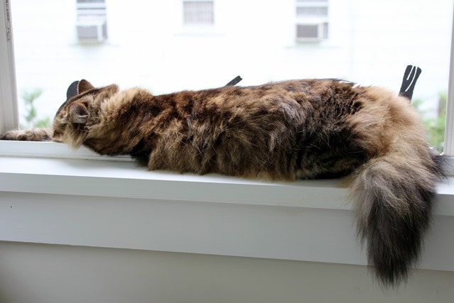 I will leave you with this awesome photo of Zara’s new favorite sleeping spot. She smushes herself into the open windows pressed up to the screen. I have no idea how this is comfortable.