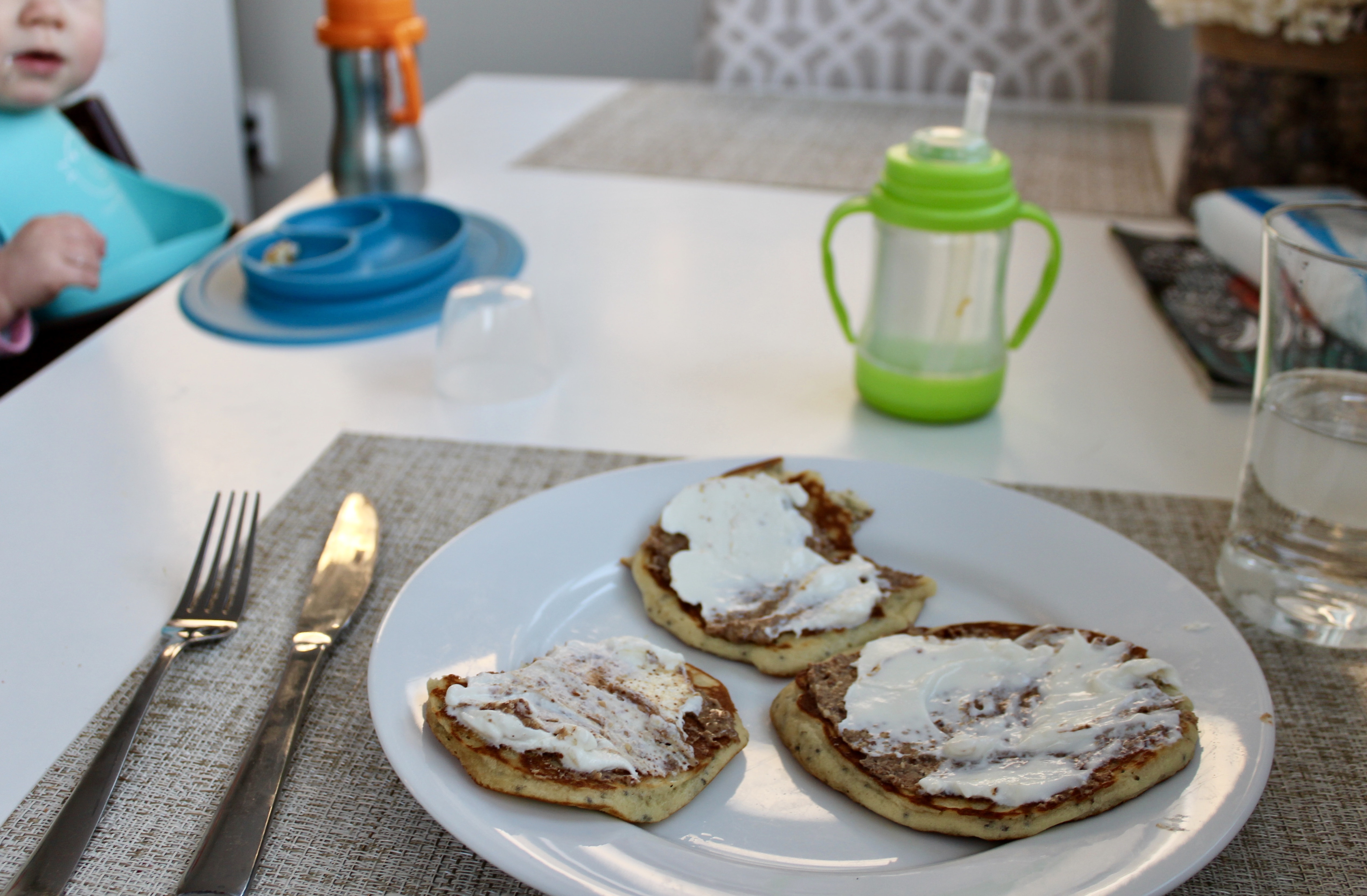 On Sunday morning, it was all about the pancakes! We used a box mix but made it with milk instead of water for more flavor (and protein), and I also added a few tablespoons of chia seeds to the batter to amp up the healthy fat. Riese loved them and so did we. We had ours topped with almond butter and plain yogurt!