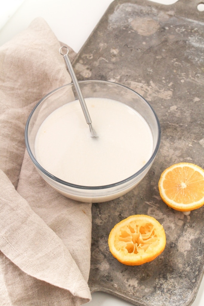 - To make the vegan buttermilk, place 2 tablespoons of lemon or lime juice in a measuring cup, then add almondmilk until the 2 cup line is reached. Let sit/curdle for a few minutes, then it's ready to use!