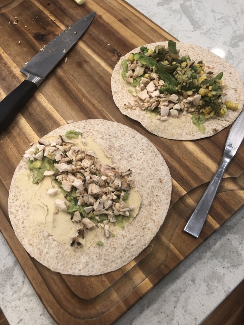Riese and I had two similar wrap variations for lunch this week. First was leftover grilled chicken and hummus, with some greens added to mine. I ended up chopping Riese’s chicken up a little smaller so it was more bite sized after taking this photo!